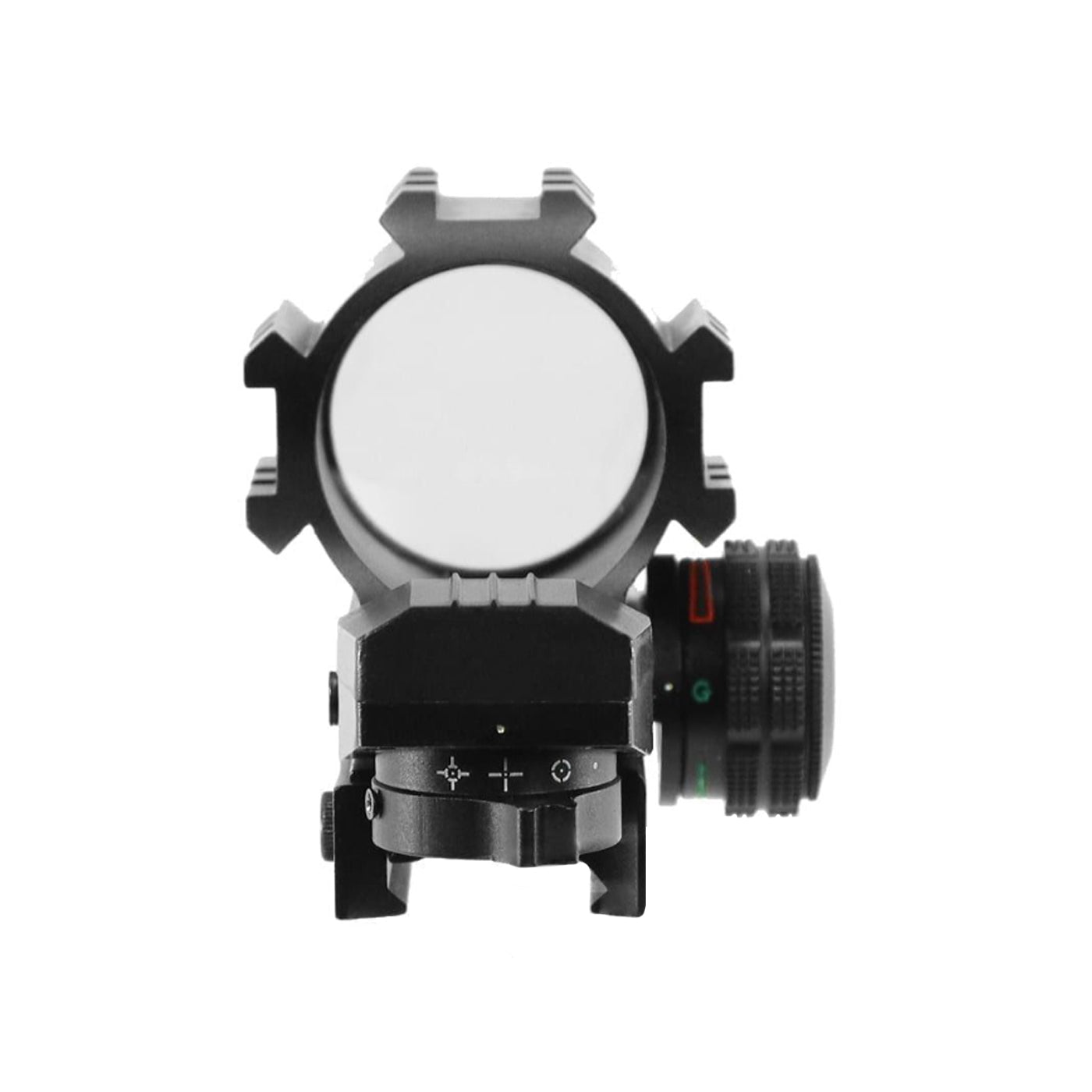 The Dot 33 MM Black Tactical Reflex Sight is a full metal sight designed for use on standard 20mm rail systems. It offers four dot target options and red or green targeting illumination, giving you precise control over your aim. Additionally, the adjustable brightness levels ensure visibility in different lighting conditions. Its sturdy metal build guarantees durability, and the included CR2032 battery allows immediate use.