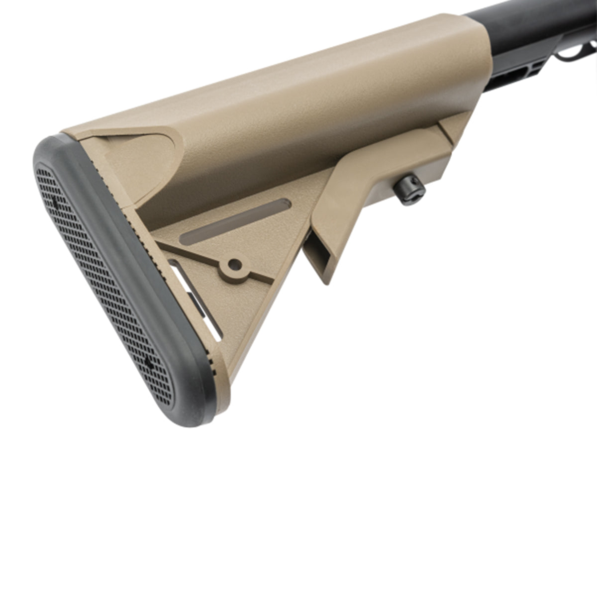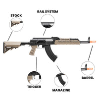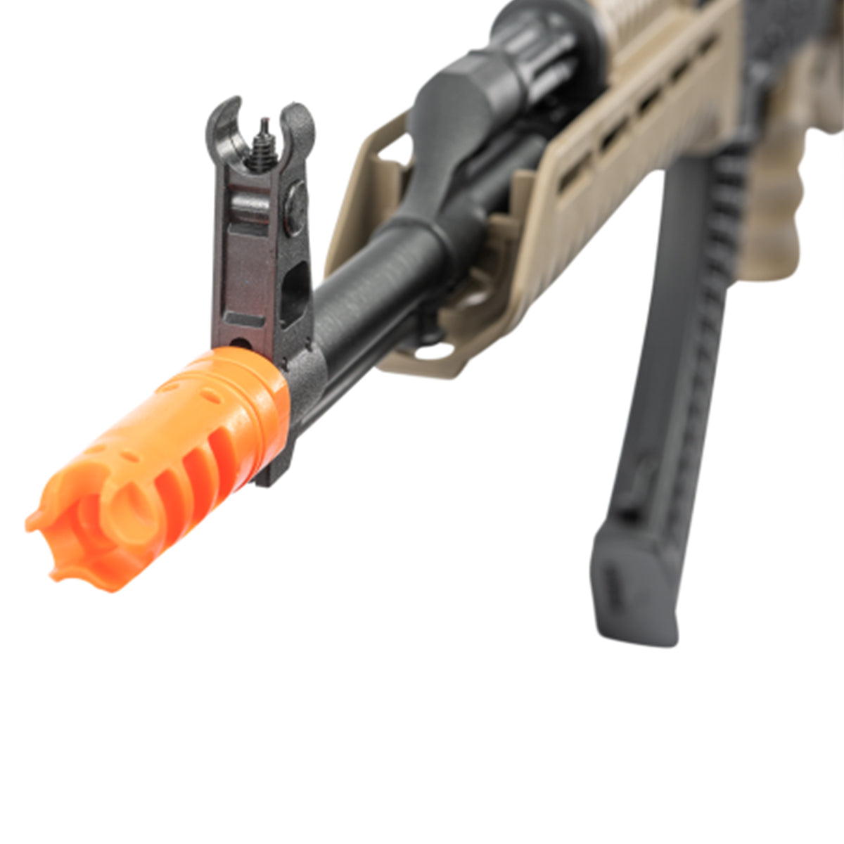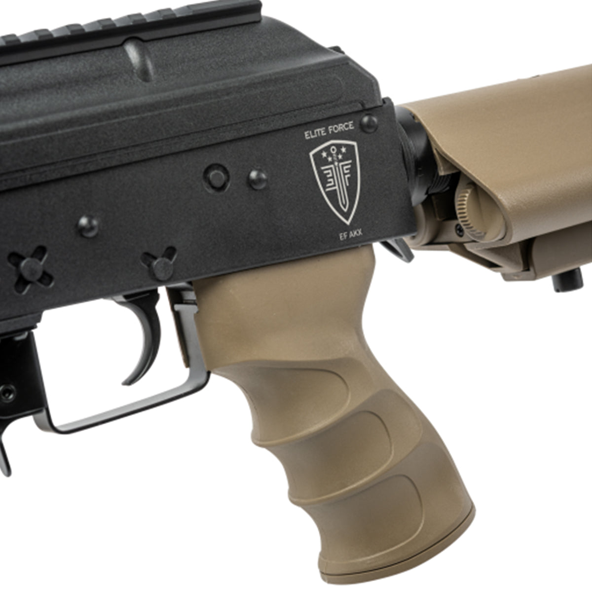 The Elite Force AKX EyeTrace AEG Airsoft Rifle - 500 Rounds offers powerful performance with its built-in tracer unit, lighting up tracer BBs for more exciting gameplay. Also, it features a 19.5-inch barrel, firing at 430 FPS with .20g BBs. Moreover, it includes a Picatinny rail for optics, an hand guard, and an adjustable stock, allowing full customization. Additionally, the comfortable grip and tan finish ensure durability for airsoft players.