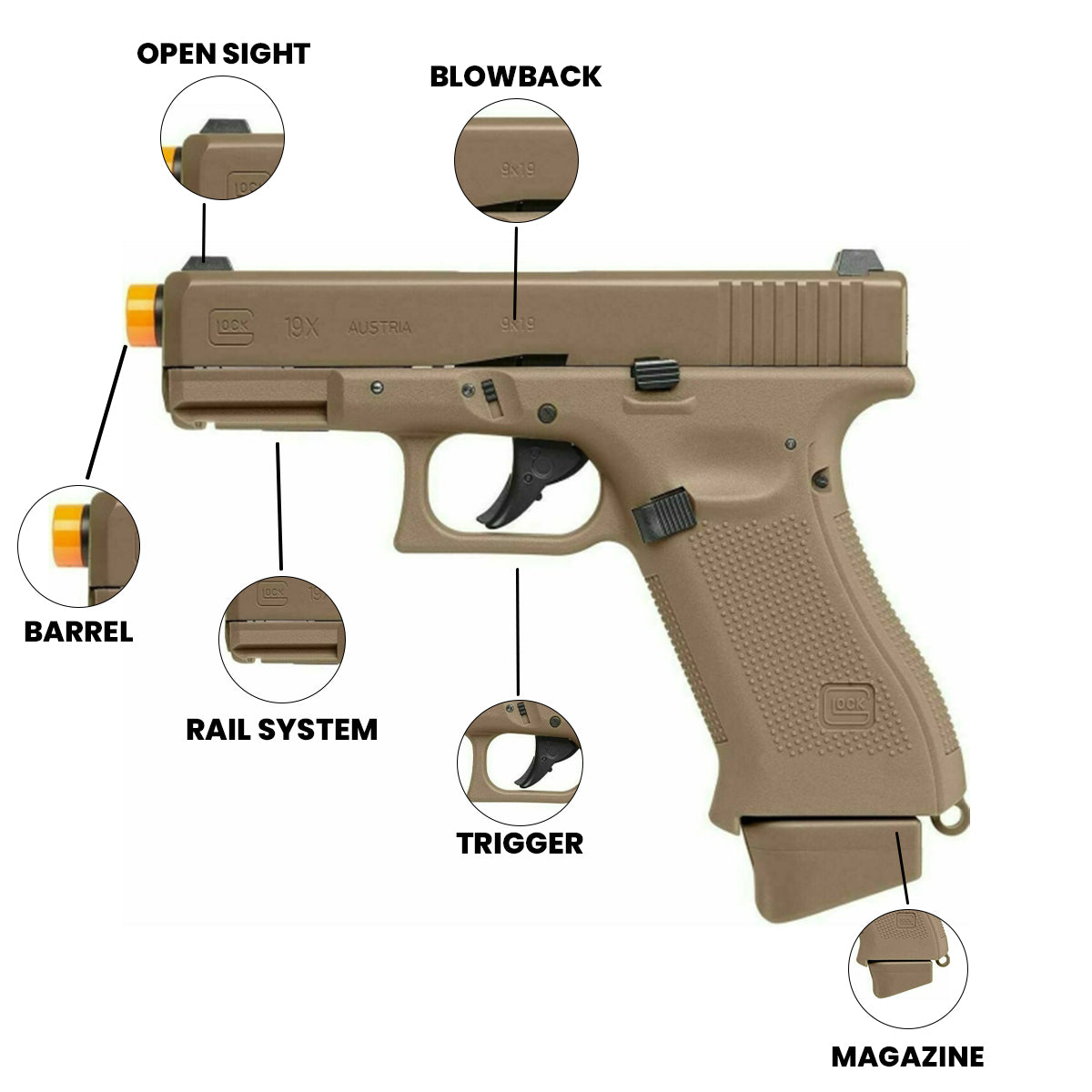 GLOCK G19X GBB Airsoft Pistol - 6mm, 23 Rounds, Coyote Tan