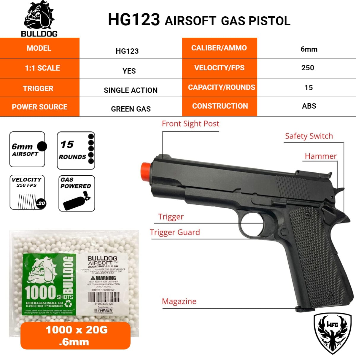 - Package Includes: Airsoft pistol, magazine, 1000 Bulldog Bio BBs, user’s manual