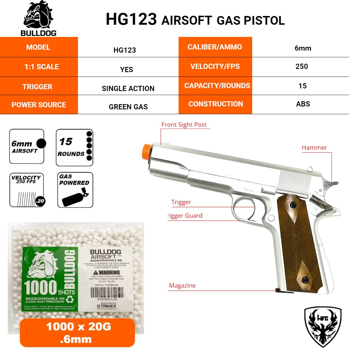 Furthermore, the HFC Airsoft Gas 1911 Non-Blowback Pistol package includes 1000 free Bulldog Bio BBs, so you're ready to play right away. Whether you're a beginner or a seasoned player, this 1911 gas-powered pistol provides consistent accuracy and power. As a result, this pistol delivers both reliability and efficiency, making it an excellent choice for any airsoft enthusiast.