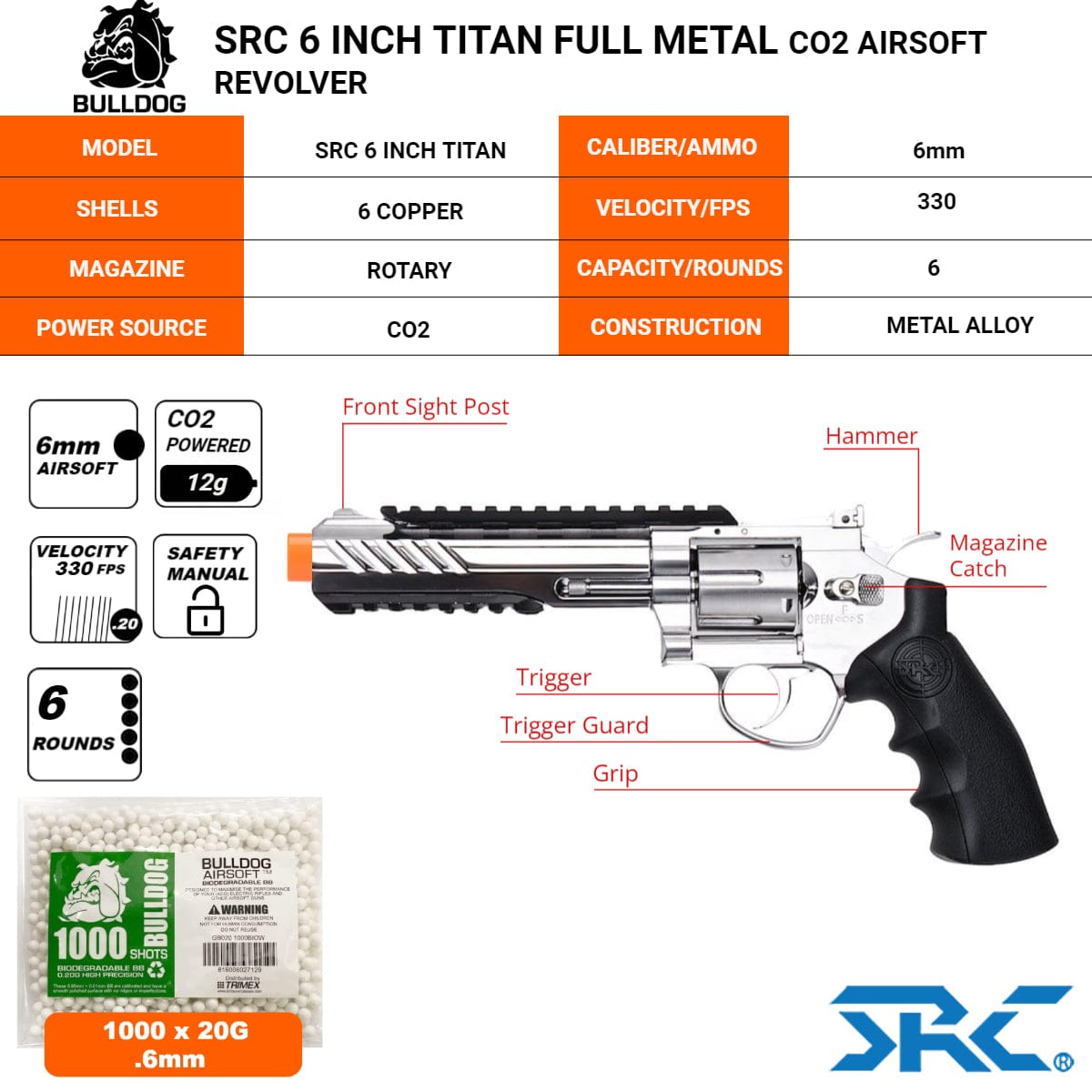 Furthermore, the SRC 6" Titan CO2 Airsoft Revolver Silver offers a realistic design with six metal shells, a metal cylinder, and an ejector rod. Moreover, the swing-out cylinder and manual safety enhance the lifelike experience. Additionally, the front sight and molded plastic grip ensure improved functionality and ease of use. Therefore, it’s a must-have for airsoft enthusiasts who value performance and realism.